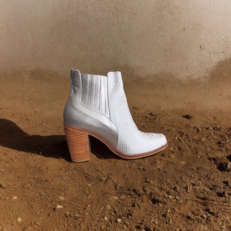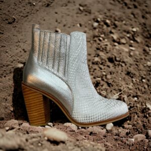 Botín de mujer de exclusivo diseño, que realza tu vestuario, posee elásticos laterales, que permiten un práctico calce, hermosa textura en combinaciones de cueros color plateado. Disfruta de la comodidad y exclusividad de este hermoso modelo.