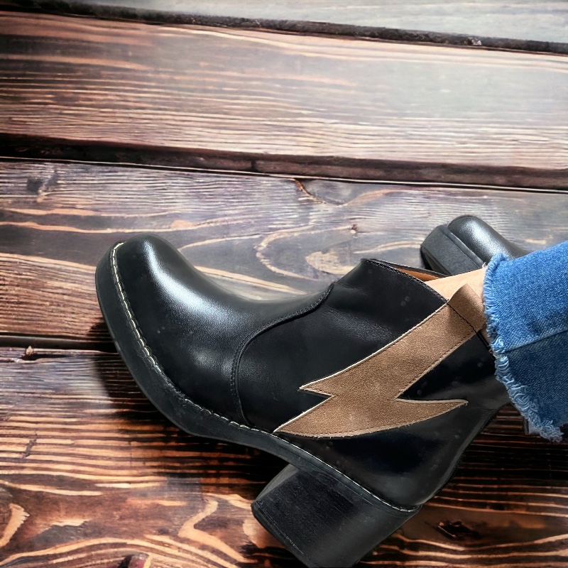 Botín de cuero diseñado con un relieve a un costado exterior, en cuero color camel. Versátil y olgado a la altura de tobillo, perfecto match para tu closet.