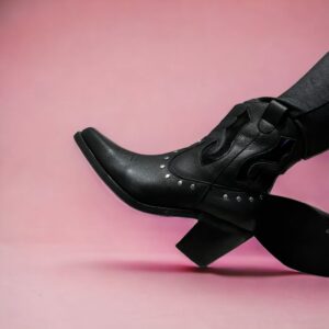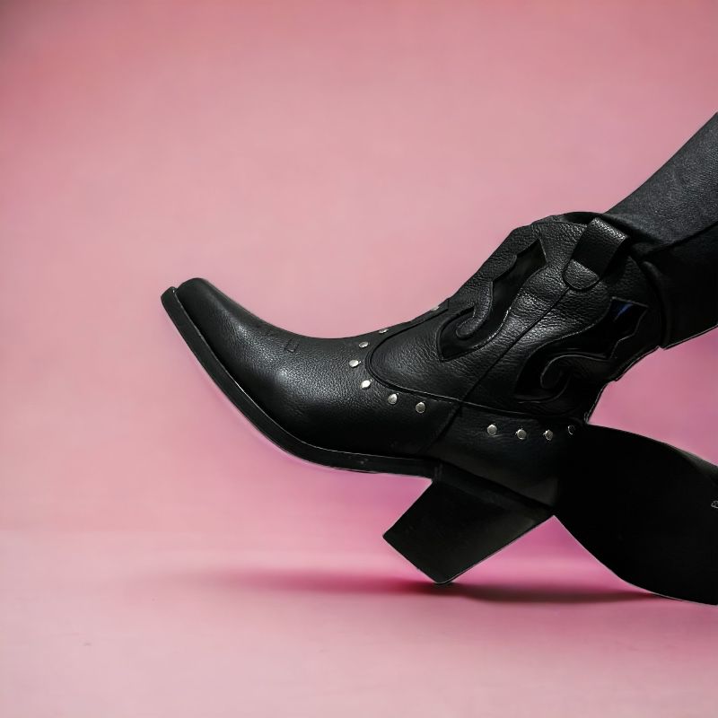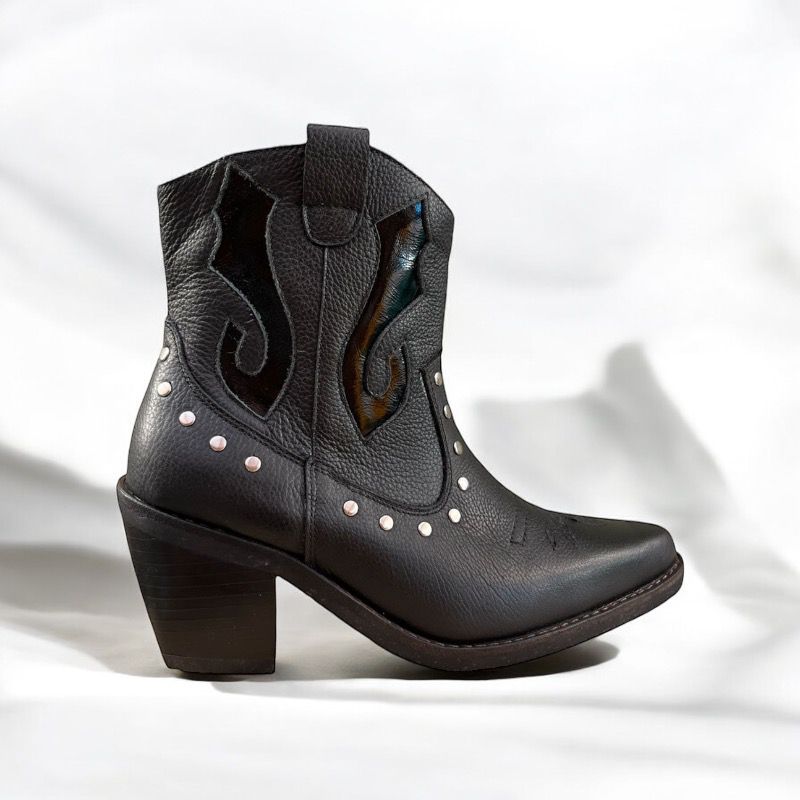 Hermoso y cómodo botín, confeccionado en cuero negro, relieves y tachas para un estilo vaquero, posee cierre interno para un mejor calce, forro de badana en su interior, altura media, cómodo ideal para uso frecuente, ideal para complementarlo a cualquier vestuario.