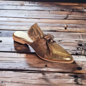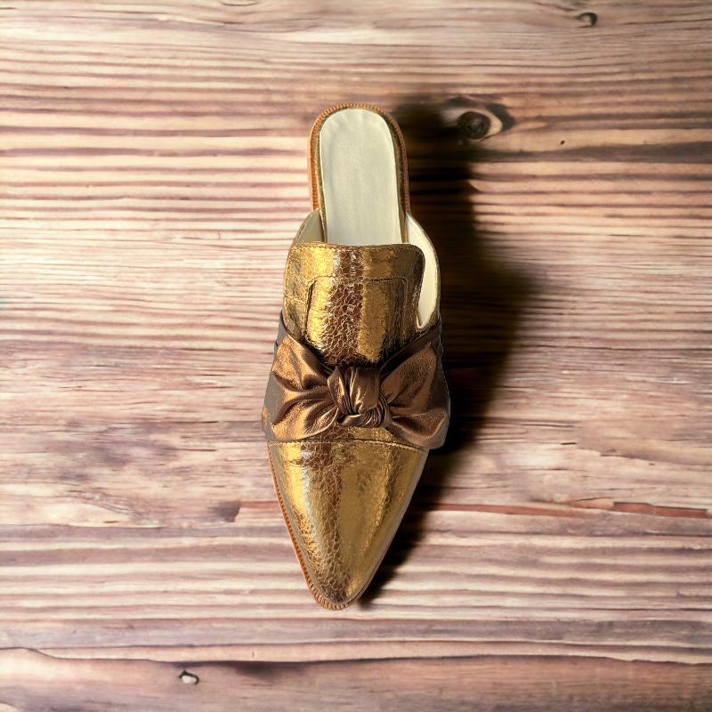Babucha de mujer, calzado ligero sin talón, calidad única en cuero, con un atractivo diseño en cuero color bronce, suave interior de cuero natural, muy cómodo, sin altura. Disfruta este hermoso modelo, inspirado para usarlo en forma frecuente, versátil para todo tipo de vestuario.