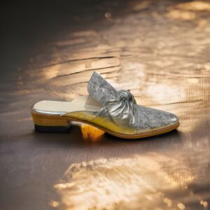 Babucha de mujer, calzado ligero sin talón, calidad única en cuero, con un atractivo diseño en cuero color Plateado, suave interior de cuero natural, muy cómodo, sin altura. Disfruta este hermoso modelo, inspirado para usarlo en forma frecuente, versátil para todo tipo de vestuario.