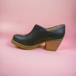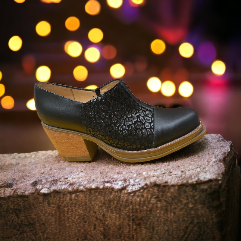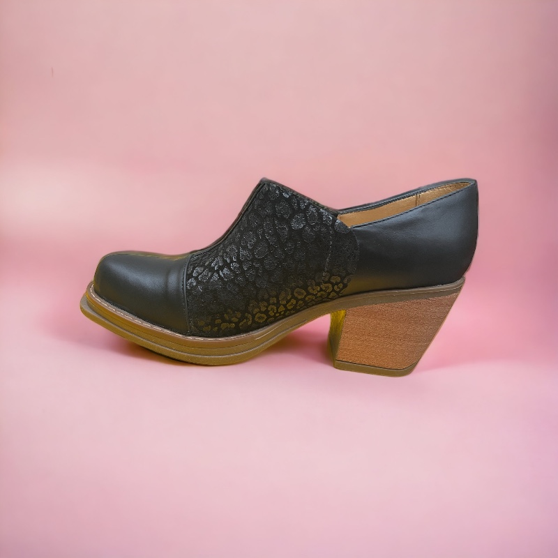 Hermoso y cómodo calzado, suave interior de badana, bordes laterales y elástico en corte medio, excelente calce, ideal para empeine alto. Diseñado en combinaciones de cuero en color negro.